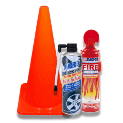 Inflador de Llantas, 15oz ABRO + Extinguidor de Fuego, 500ml ABRO + Cono de Seguridad 12″ ABRO